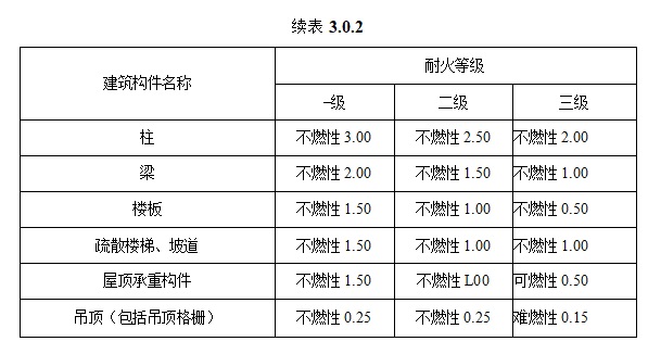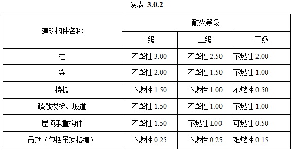 3.0.2 汽车库、修车库的耐火等级应分为一级、二级和三级,其构 件的燃烧性能和耐火极限均不应低于表3. 0.2的规定。