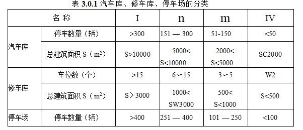 3.0.1 车库、修车库、停车场的分类应根据停车(车位)数量和 总建筑面积确定,并应符合表3. 0. 1的规定。