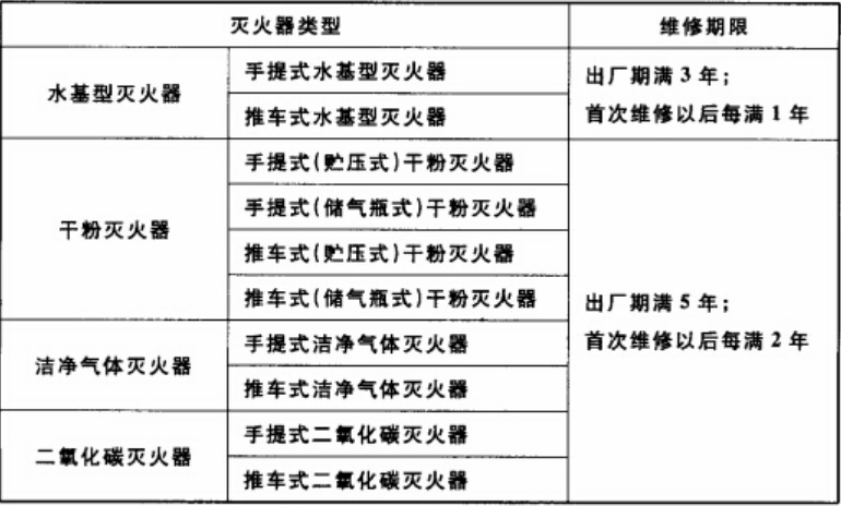 5.3.2 本条对灭火器的维修期限做出了详细规定。只要达到或超过维修期限,即使灭火器未曾使用过,也应送修。本条还规定了首次维修之后的灭火器维修期限间隔。