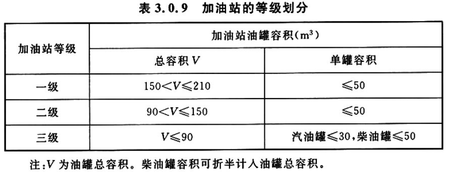 3.0.9 加油站的等级划分应符合表3.0.9的规定。