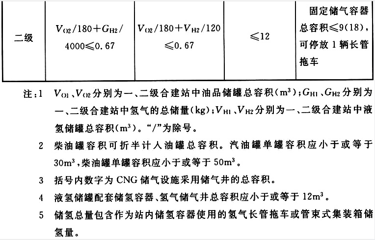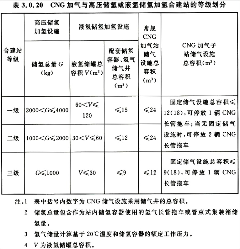 3.0.20 CNG加气与高压储氢或液氢储氢加氢合建站的等级划分,应符合表3.0.20的规定。