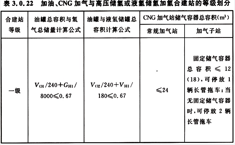 3.0.22 加油、CNG加气与高压储氢或液氢储氢加氢合建站的等级划分,应符合表3.0.22的规定。