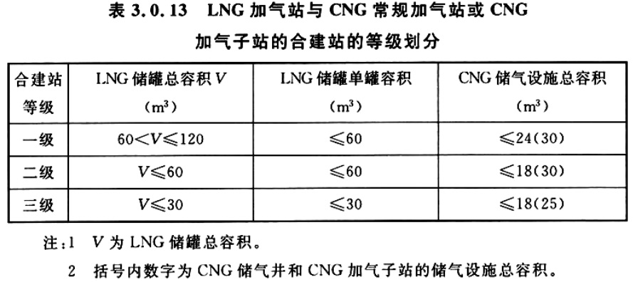 3.0.13 LNG加气站与CNG常规加气站或CNG加气子站的合建站的等级划分,应符合表3.0.13的规定。