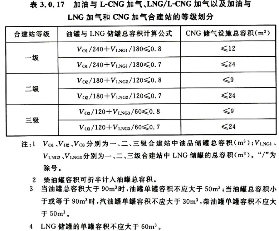 3.0.17 加油与L-CNG加气、LNG/L-CNG加气以及加油与LNG加气和CNG加气合建站的等级划分,应符合表3.0.17的规定。