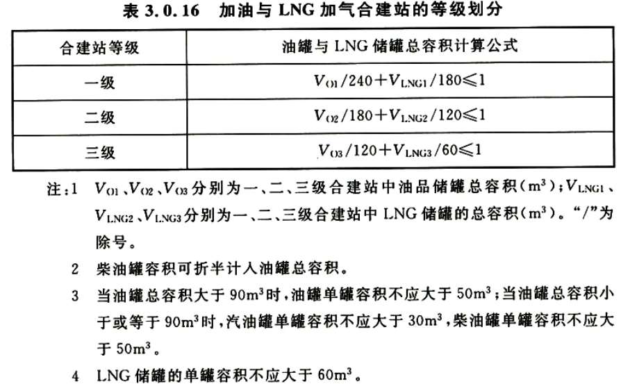 3.0.16 加油与LNG加气合建站的等级划分应符合表3.0.16的规定。