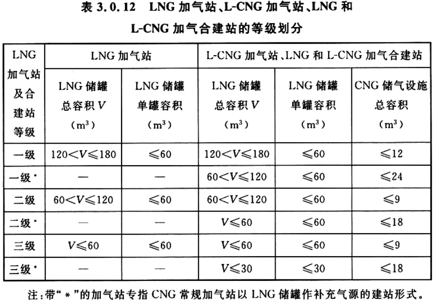 3.0.12 LNG加气站、L-CNG加气站、LNG和L-CNG加气合建站的等级划分,应符合表3.0.12的规定。