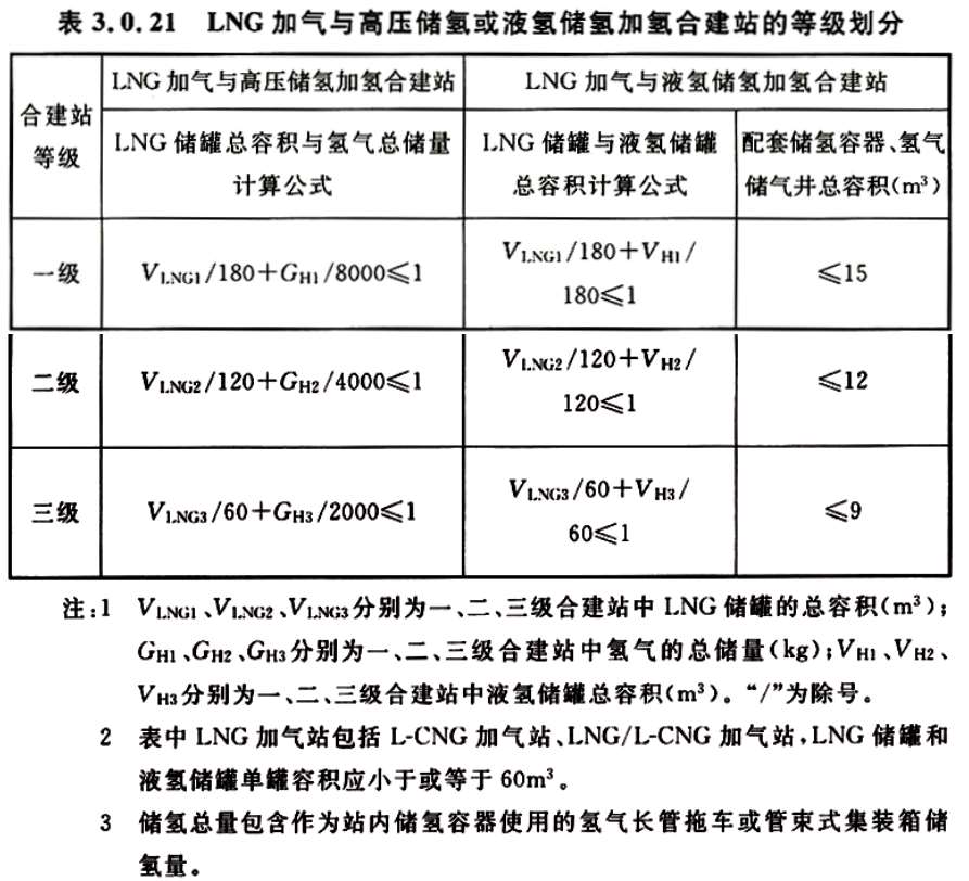 3.0.21 LNG加气与高压储氢或液氢储氢加氢合建站的等级划分,应符合表3.0.21的规定。