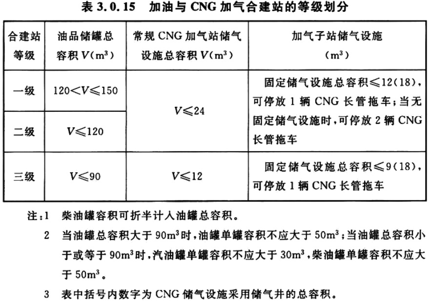 3.0.15 加油与CNG加汽合建站的等级划分应符合表3.0.15的规定。