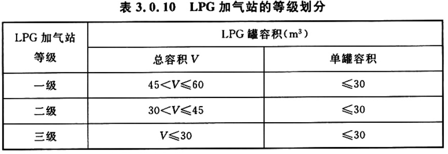 3.0.10 LPG加气站的等级划分应符合表3.0.10的规定。