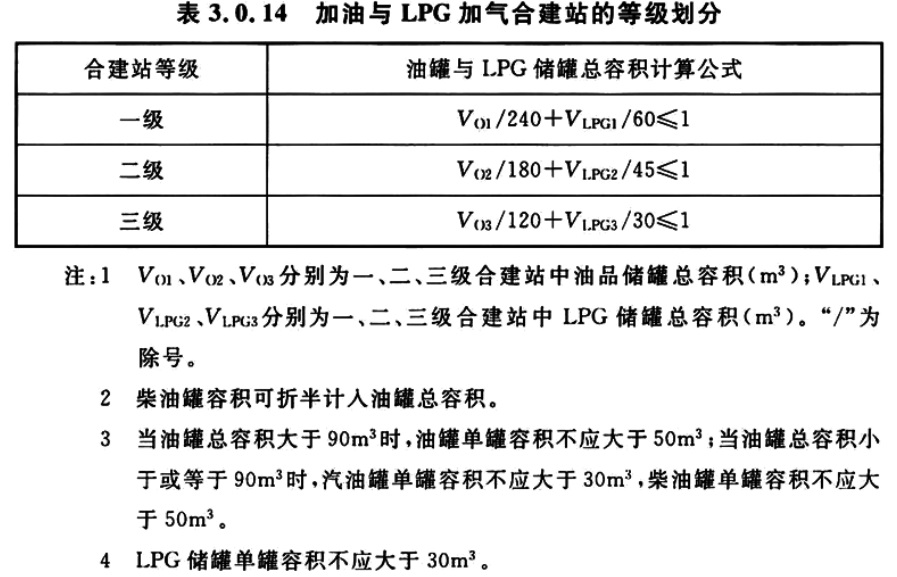 3.0.14 加油与LPG加气合建站的等级划分,应符合表3.0.14的规定。