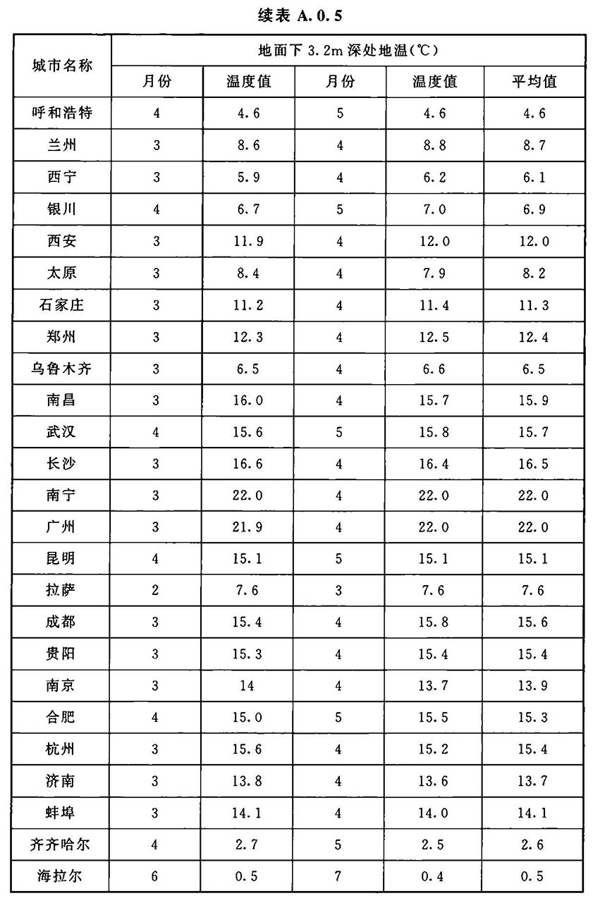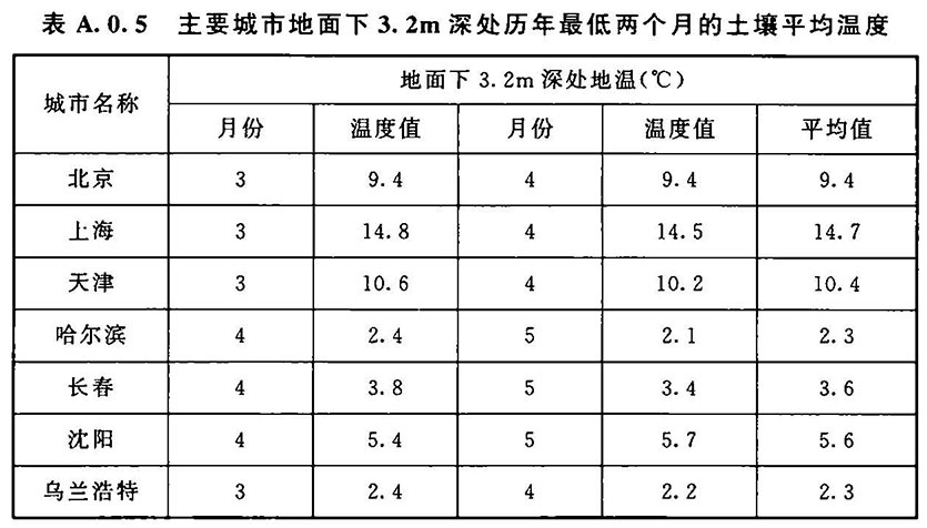 A.0.5 土壤温度取地面下3.2m深处历年最低两个月的土壤平均温度,应按表A.0.5的规定确定。当缺少该项资料时,可按当地年平均气温减2℃计算。