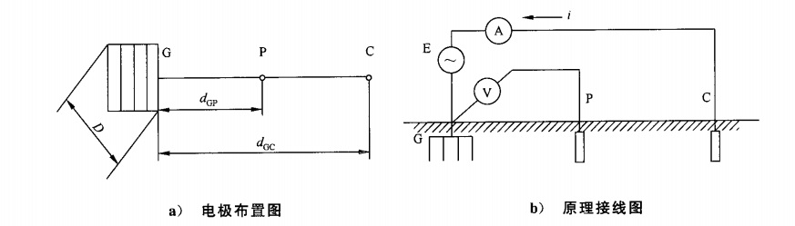 三极法的三极是指图B.1上的被测接地装置G,测量用的电压极P和电流极C。图中测量用的电 流极C和电压极P离被测接地装置G边缘的距离为dGc = 4D〜5D和dGP = 0.5dGcc~0.6dGc,D为被测接地装置的最大对角线长度,点P可以认为是处在实际的零电位区内。为了较准确地找到实际零电位区时,可把电压极沿测量用电流极与被测接地装置之间连接线方向移动3次,每次移动的距离约为dGc的5%,测量电压极P与接地装置G之间的电压。如果电压表的3次指示值之间的相对误差不超过 5%,则可以把中间位置作为测量用电压极的位置。