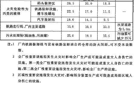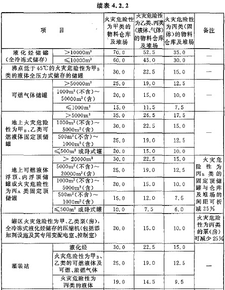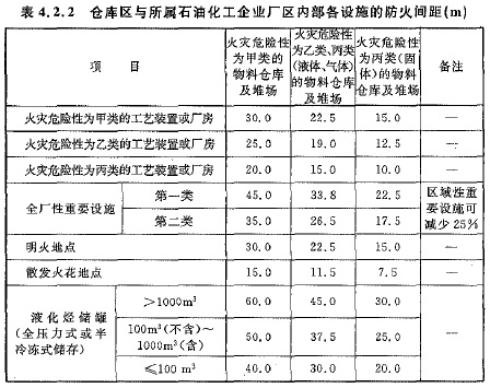 4.2.2 仓库区与所属石油化工企业厂区内部各设施的防火间距,不成小于表4.2.2 的规定。