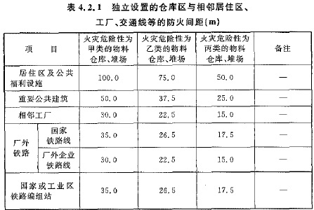 4.2.1 独立设置的仓库区与相邻居住区、工厂、交通线等的防火间距,不应小于表4.2.1 的规定。间距起讫点应符合本规范附录A 的规定