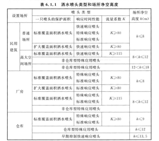 6.1.1 设置闭式系统的场所,洒水喷头类型和场所的最大净空高度应符合表6.1.1的规定;仅用于保护室内钢屋架等建筑构件的洒水喷头和设置货架内置洒水喷头的场所,可不受此表规定的限制。