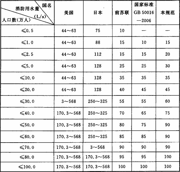 美国、日本和前苏联均按城市人口数的增加而相应增加消防用水量。例如,在美国,人口不超过20万的城市消防用水量为44L/s~63L/s,人口超过30万的城市消防用水量为170.3L/s~568L/s;日本也基本如此。本规范根据火场用水量是以水枪数量递增的规律,以2支水枪的消防用水量(即15L/s)作为下限值,以100L/s作为消防用水量的上限值,确定了城镇消防用水量。本规范与美国、日本和前苏联的城镇消防用水量比较,见表1。