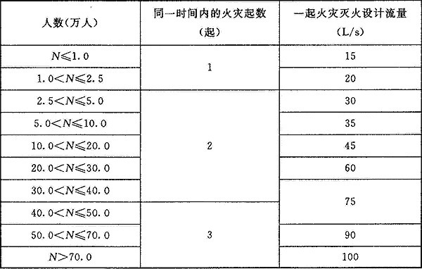 3.2.2 本条给出城镇的市政消防给水设计流量,以及同时火灾起数,以确定市政消防给水设计流量。本条是在现行国家标准《建筑防火设计规范》GB 50016-2006的基础上制订。