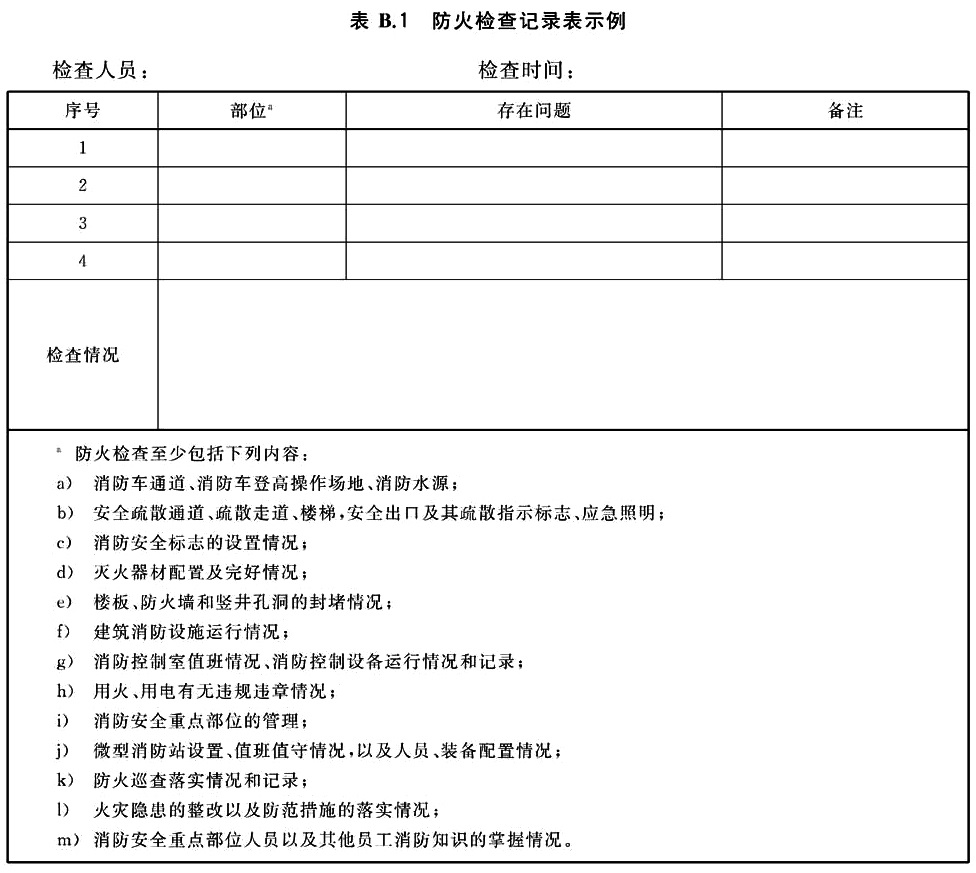 防火检查记录表示例见表B.1。