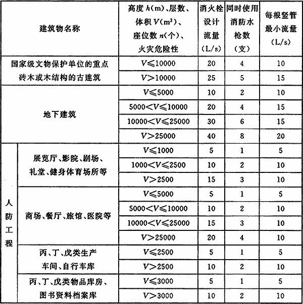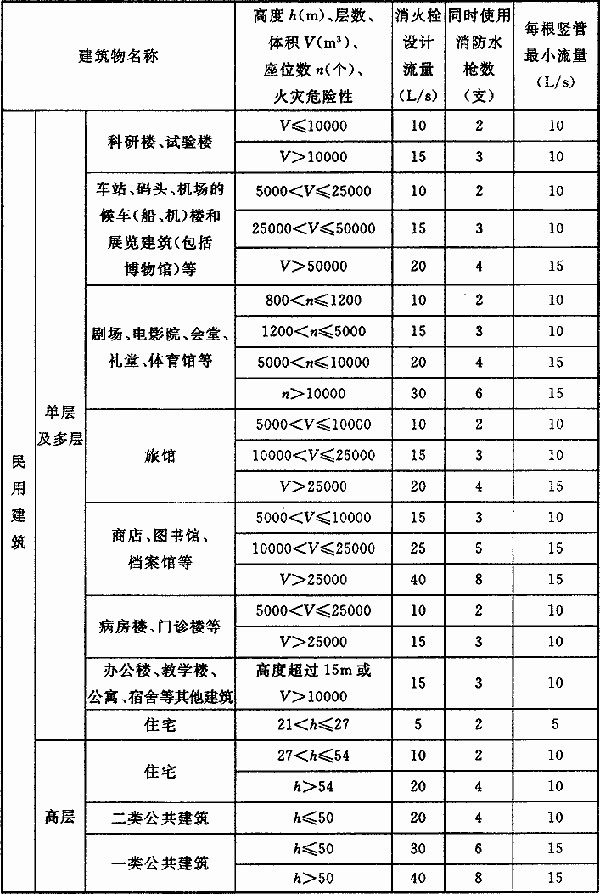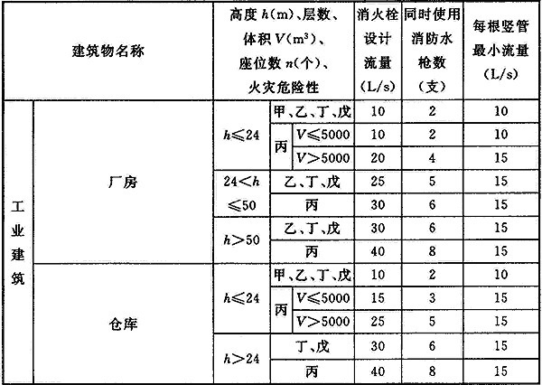 注:1 丁、戊类高层厂房(仓库)室内消火栓的设计流量可按本表减少10L/s,同时使用消防水枪数量可按本表减少2支;