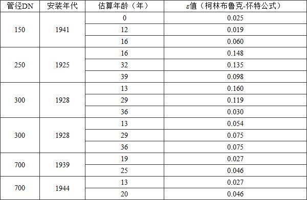在水力计算时,其他的参数很容易就可以确定,管道粗糙度k的取值尤为关键。球墨铸铁管采用旋转喷涂的工艺,得到一个光滑的、均匀的水泥砂浆内衬。圣戈班穆松桥进行了一系列的试验,已经得出了内衬的粗糙度k值。其平均值为0.03mm,当和绝对光滑的管道ε=0比较时(计算流速为1m/s),对应的额外水头损失为5%~7%。不管怎样,管道的相关表面粗糙度不仅依赖于管道表面的均匀性,而且特别依赖于弯头、三通和其他连接形式的数量,如管线纵剖面的不规则性。经验显示ε=0.1对于配水管线来说是一个合理的数值。对于每千米只有几个管件的长距离的管线来说,ε的取值可以稍微地降低(可取系数0.6~0.8)。当然,ε的取值还应当包括其他因素的影响,如水质的不同等。圣戈班穆松桥进行ε值试验时的部分管道数据见表5。