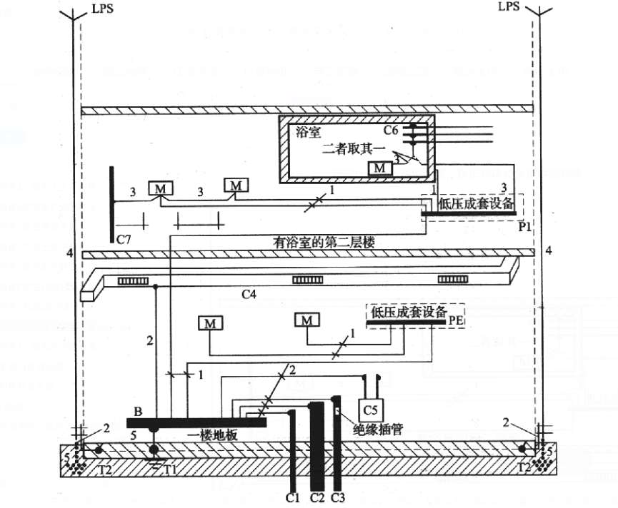 M—外露可导电部分;C—外界可导电部分;C1—外部进来的金属水管;C2—外部进来的金属排弃废物、排水管道;C3—外部进来的带绝缘插管的金属可燃气体管道;C4—空调;C5—供热系统;C6—金属水管,比如浴池里的金属水管;C7—在外露可导电部分的伸臂范围内的外界可导电部分;B—总接地端子(总接地母线);T—接地极;T1—基础接地;T2—LPS(防雷装置)的接地极(若需要的话);1—保护导体;2—保护联结导体;3—用作辅助联结用的保护联结导体;4—LPS(防雷装置)的引下线;5—接地导体