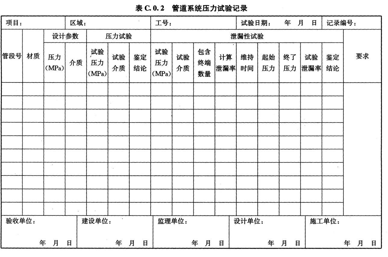 C.0.2 医用气体施工中管道系统压力试验记录可按表C.0.2的格式进行。