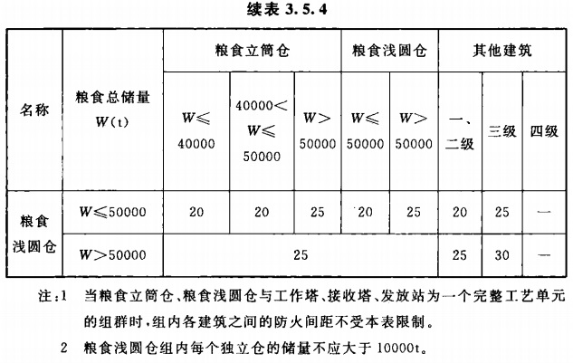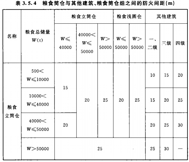 3.5.4 粮食筒仓与其他建筑、粮食筒仓组之间的防火间距,不应小于表3.5.4的规定。