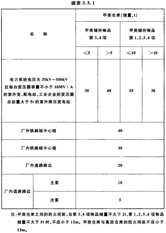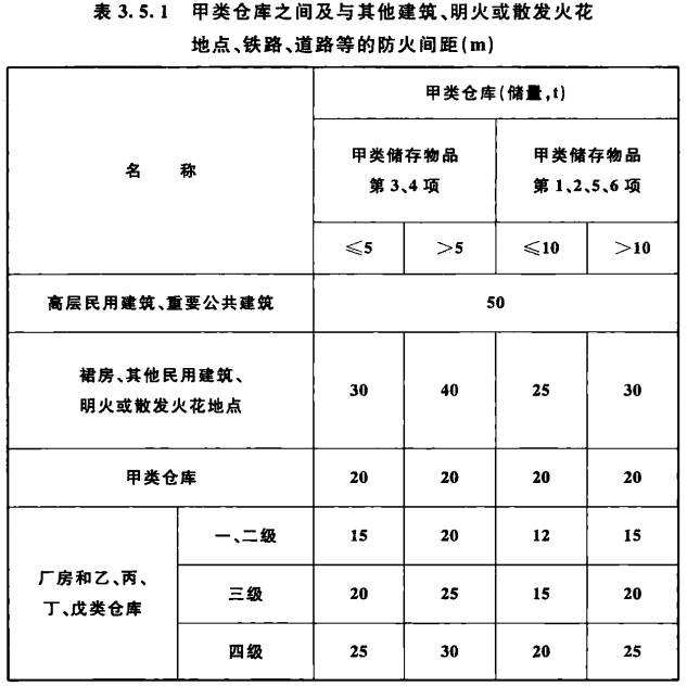 3.5.1 甲类仓库之间及与其他建筑、明火或散发火花地点、铁路、道路等的防火间距不应小于表3.5.1的规定。