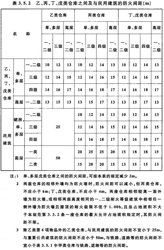 3.5.2 除本规范另有规定外,乙、丙、丁、戊类仓库之间及与民用建筑的防火间距,不应小于表3.5.2的规定。