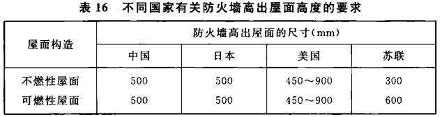 本条中的数值是根据我国有关火灾的实际调查和参考国外有关标准确定的。不同国家有关防火墙高出屋面高度的要求,见表16。设计应结合工程具体情况,尽可能采用比本规范规定较大的数值。