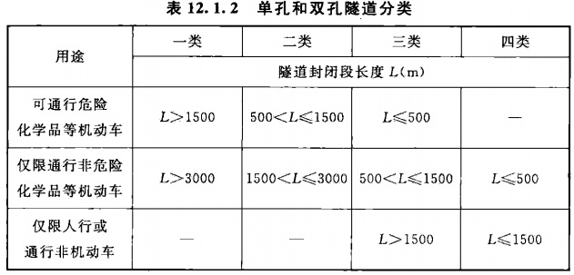 12.1.2 单孔和双孔隧道应按其封闭段长度和交通情况分为一、二、三、四类,并应符合表12.1.2的规定。