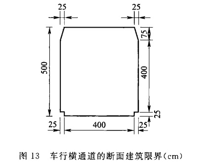 (2) 《公路隧道设计规范》JTG D70-2004对山岭公路隧道车行横通道的断面建筑限界规定,如图13所示。城市交通隧道对通行车辆种类有严格的规定,如有些隧道只允许通行小型机动车、有些隧道禁止通行大、中型货车、有些是客货混用隧道。横通道的断面建筑限界应与隧道通行车辆种类相适应,仅通行小型机动车或禁止通行大型货车的隧道横通道的断面建筑限界可适当降低。