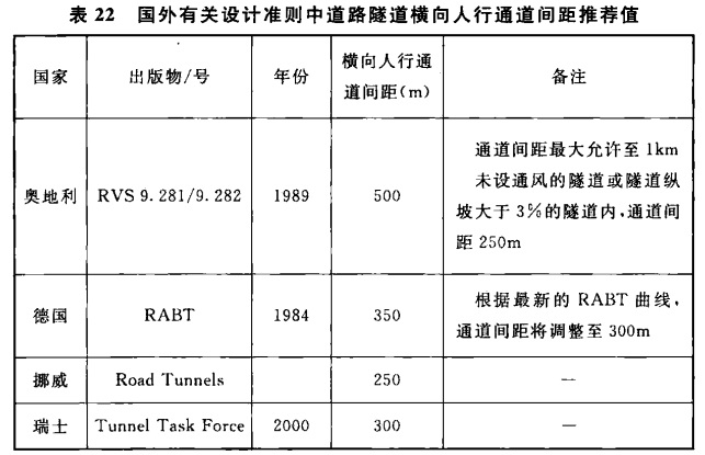 根据荷兰及欧洲的一系列模拟实验,250m为隧道内的人员在初期火灾烟雾浓度未造成更大影响情况下的最大逃生距离。行业标准《公路隧道设计规范》JTG D70-2004规定了山岭公路隧道的人行横通道间隔:人行横通道的设置间距可取250m,并不大于500m。美国消防协会《公路隧道、桥梁及其他限行公路标准》NFPA 502(2011年版)规定:隧道应有应急出口,且间距不应大于300m;当隧道采用耐火极限为2.00h以上的结构分隔,或隧道为双孔时,两孔间的横通道可以替代应急出口,且间距不应大于200m。其他一些国家对人行横通道的规定如表22。